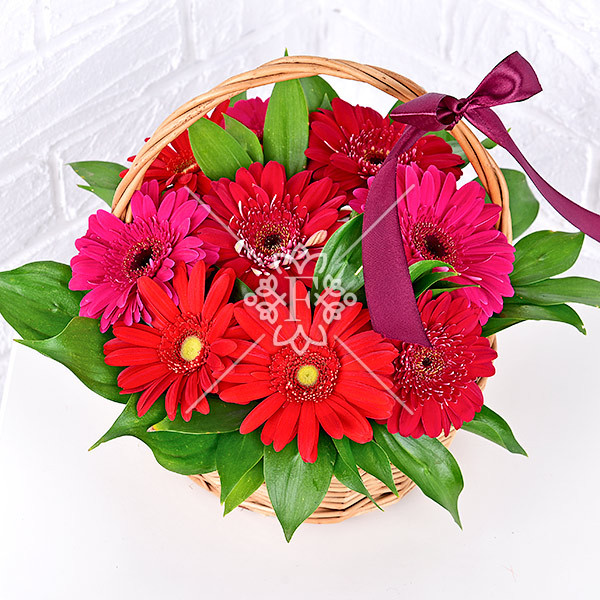 гербера красная, малиновая – 7 шт., зелень декоративная (рускус), оазис, корзинка
